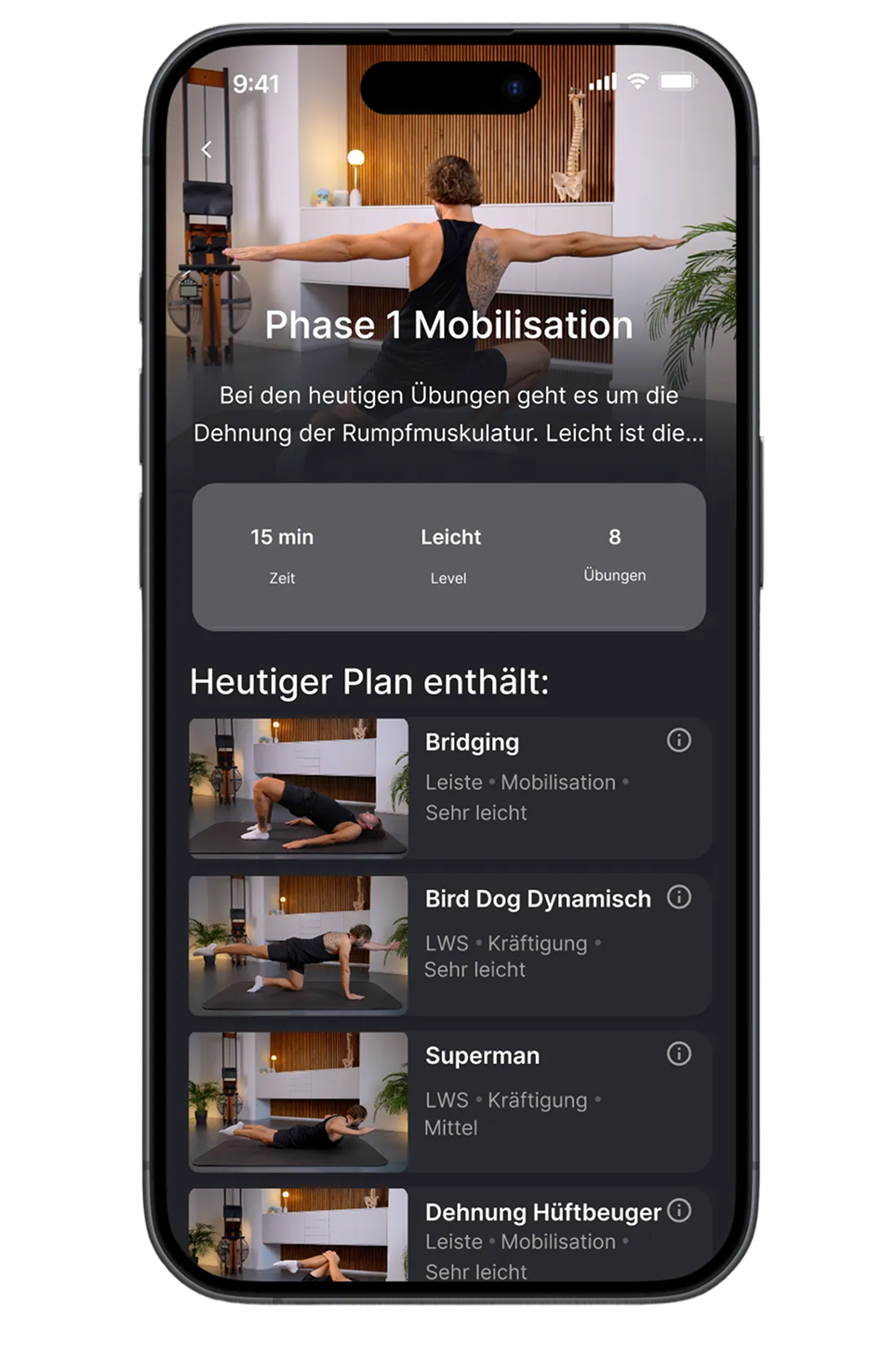 Du gibst Deine Beschwerderegion(en) an und erhältst darauf basierend einen personalisierten Plan. Eine Region dauert in der Regel etwa 15 Minuten. Jede weitere Region verlängert das Training um ungefähr 4 Minuten.